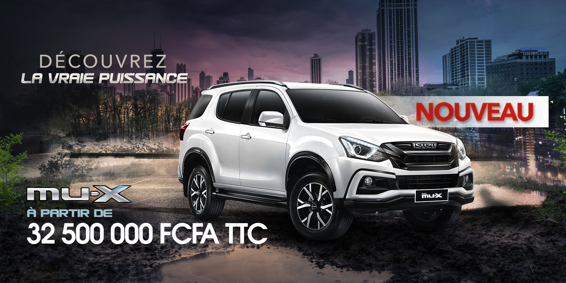 Sur la route, comme en tout-terrain, le MU-X, 7 places, fonctionne à la perfection. Grâce à la puissance exclusive de son moteur turbo diesel Isuzu de 3,0 L, son couple de 430 Nm et sa transmission intuitive à 6 vitesses, le MU-X a tout ce qu'il vous faut pour vous faire traverser la ville.